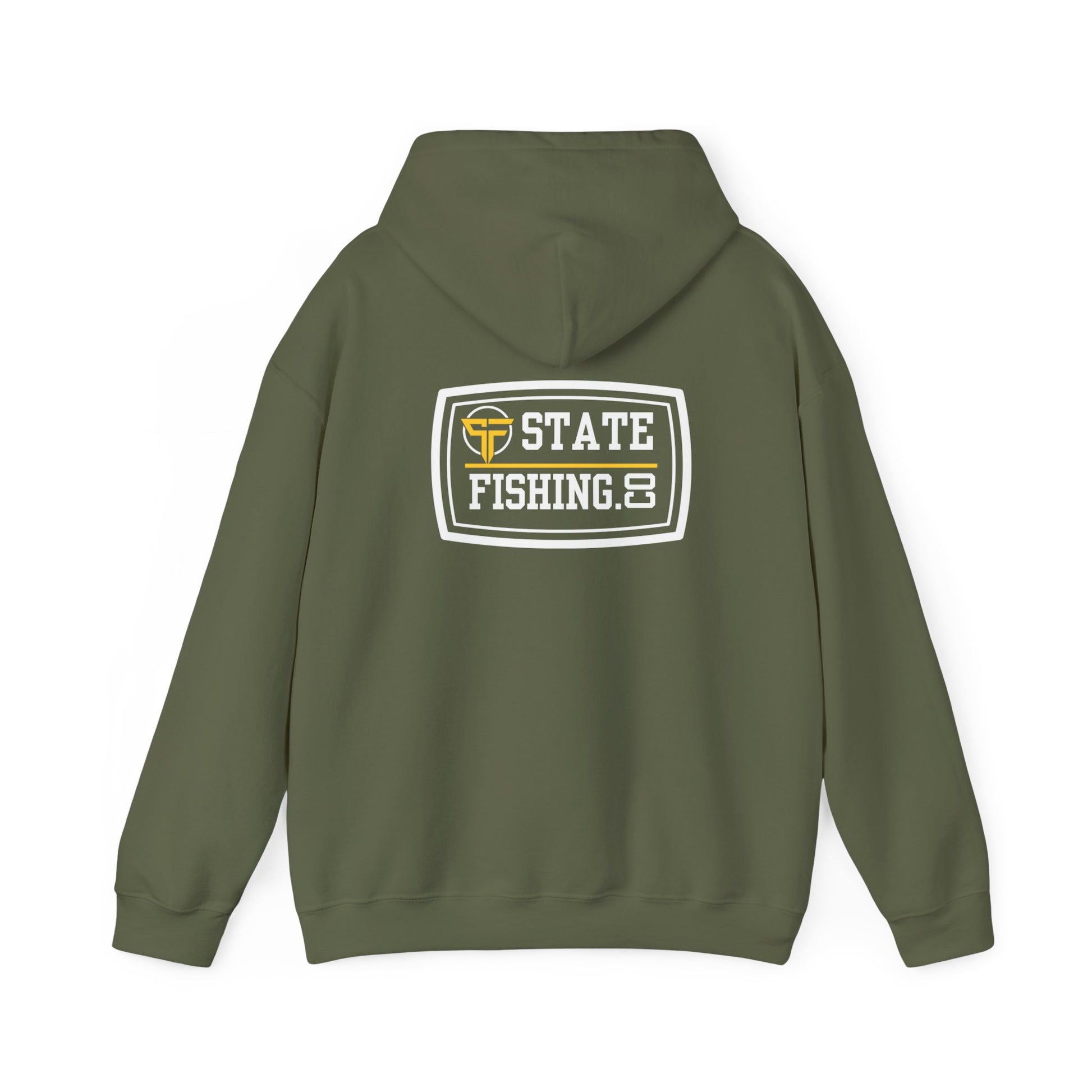 This warm and heavy hoodie offers style and fit and function.The STATE FISHING CO, badge logo hoodie is the perfect way to end the days from on the water, available in 3 colours choose from to fit your style. Cotton/ polyester blend, front pocket,